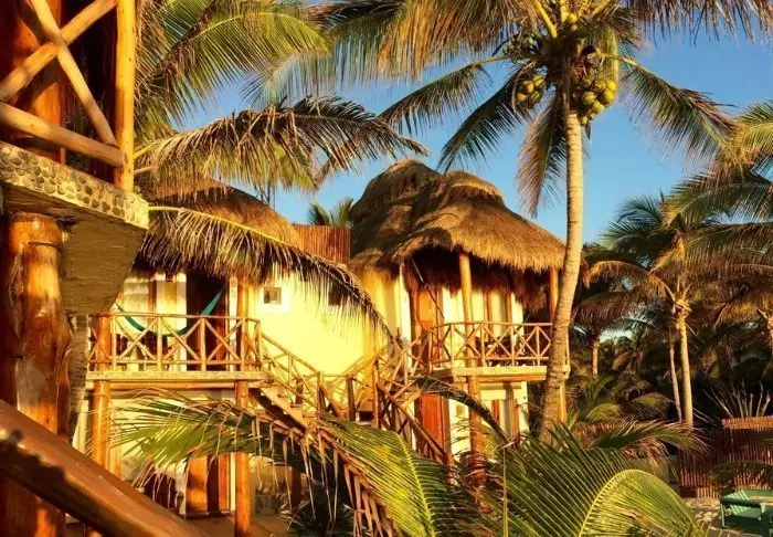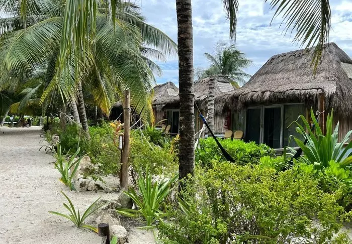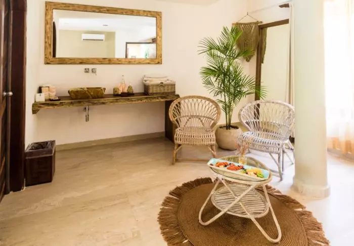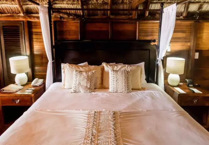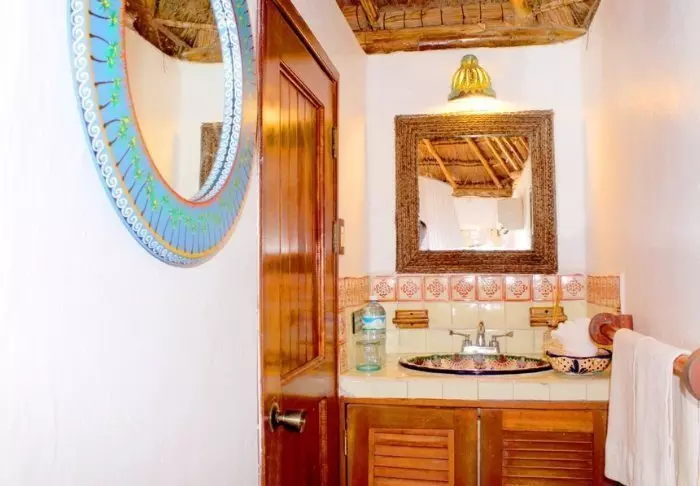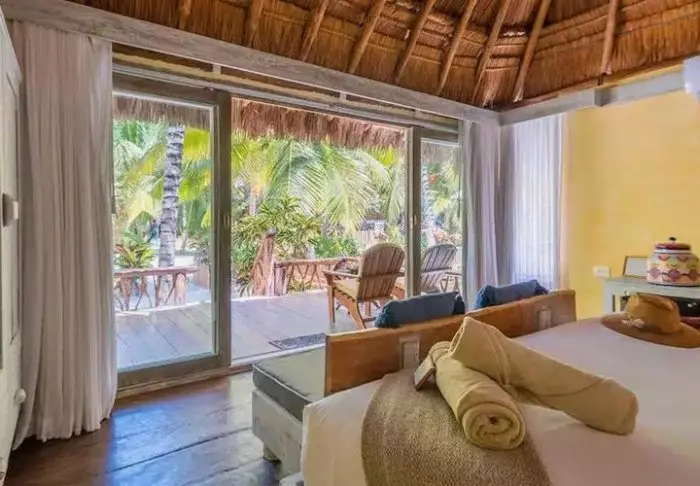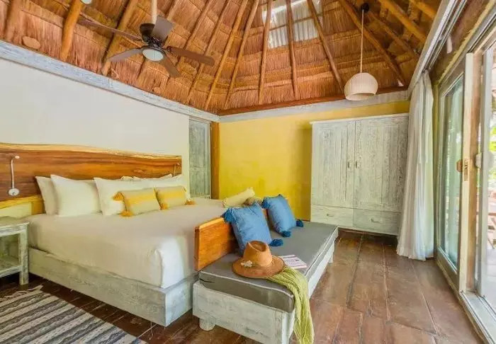Sie übernachten in charmanten Hütten aus natürlichen Materialien, inklusive einem Dach aus getrockneten Palmblättern. Die geräumigen und elegant eingerichteten Zimmer bieten eine harmonische Mischung aus hellen Tönen, farbenfrohen mexikanischen Teppichen und Kissen sowie wunderschönen dunklen Holzböden und Möbeln.