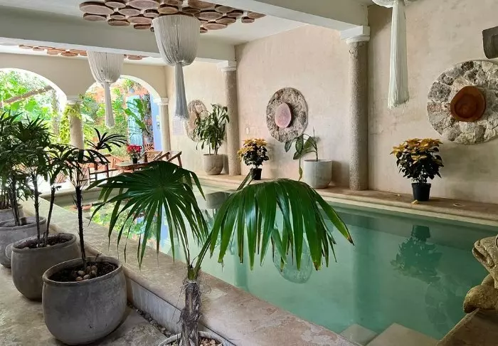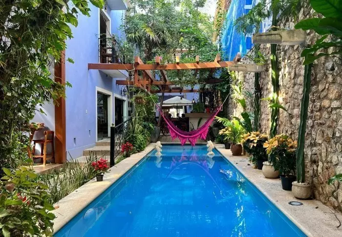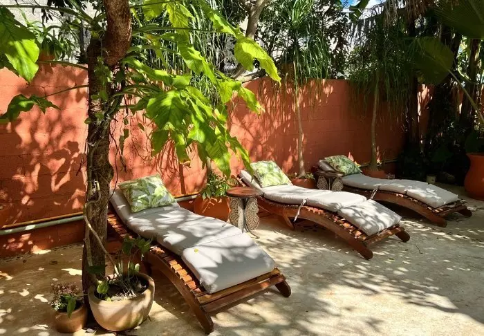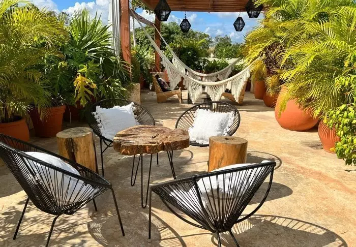 Wenn Sie nach einem ereignisreichen Tag eine Auszeit brauchen, können Sie sich in einer Sonnenliege im üppig grünen Innenhof entspannen oder ein Buch auf eine der Dachterrassen mitnehmen und es sich in einer der gehäkelten Hängematten bequem machen. Das Hotel verfügt über zwei kleine Pools: einen unter freiem Himmel und einen, der überdacht ist.