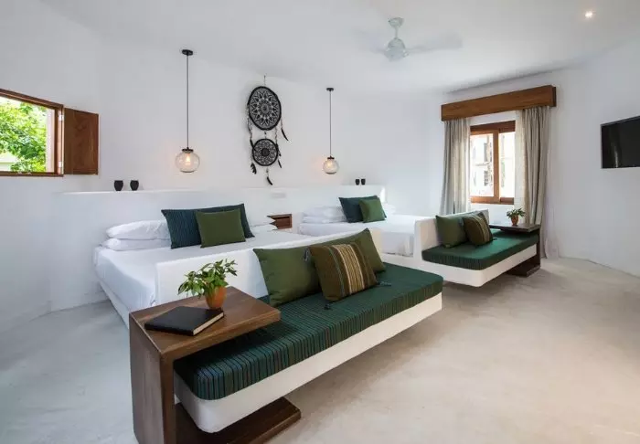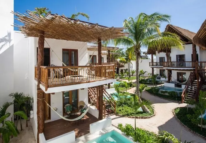Das Hotel verfügt über nur 58 Zimmer, die elegant in hellen Farben und mit stimmungsvoller mexikanischer Kunst an den Wänden eingerichtet sind. Zur Ausstattung gehören ein Badezimmer mit Pflegeprodukten und Haartrockner, Klimaanlage, Deckenventilator, Safe, WLAN, Fernseher, Kühlschrank und einer kleinen Terrasse oder einem Balkon mit Hängematte.