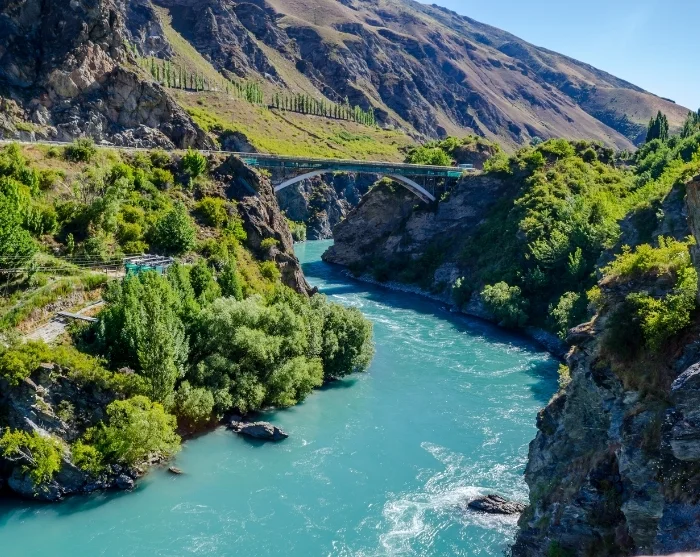 Weiter durch die Weinberge verläuft die Route durch die dramatische Kawarau-Schlucht, wo sich die Straße entlang des Flusses durch raue Felsformationen schlängelt. Unterwegs können Sie beim Goldfields Mining Centre Halt machen und Ihr Glück beim Goldwaschen versuchen oder bei der Kawarau Bridge vorbeischauen, wo Adrenalinfans einen Bungee-Sprung wagen.