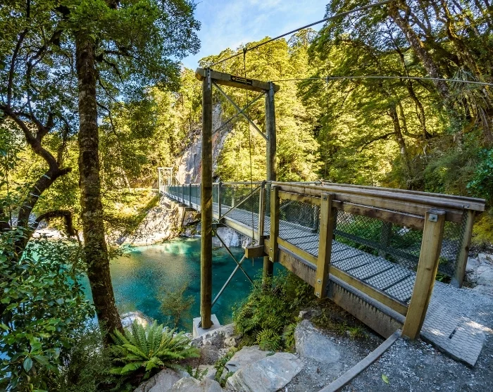 Unterwegs durchqueren Sie den Mount Aspiring Nationalpark. Hier lohnt sich ein Abstecher auf den Blue Pools Track. Dieser einfache Wanderweg führt durch Buchenwald zu klaren türkisfarbenen Wasserbecken, deren leuchtende Farbe vom Schmelzwasser der umliegenden Gletscher stammt.