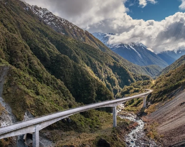 Nach Hokitika fahren Sie weiter Richtung Kumara Junction und biegen dort ostwärts auf den Highway 73 ab. Von hier beginnt der Aufstieg in den Arthur’s Pass Nationalpark. Die Landschaft verändert sich deutlich: Der Regenwald weicht alpiner Strauchvegetation, und ringsum steigen die Berge steil empor. Unterwegs lohnt sich ein Halt am Otira-Viadukt-Aussichtspunkt, von wo aus Sie fantastische Ausblicke auf das spektakuläre Viadukt genießen, das sich durch das enge Tal windet. Halten Sie auch nach dem neugierigen Kea Ausschau – dem einzigen alpinen Papagei der Welt –, der häufig in der Nähe des Parkplatzes zu sehen ist.