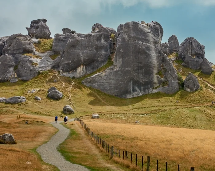 Wenn Sie die Berge hinter sich lassen und weiter ostwärts fahren, öffnet sich die Landschaft. Bald schon erwartet Sie eine der markantesten Sehenswürdigkeiten der Strecke: Castle Hill (Kura Tāwhiti). Riesige, graue Kalksteinfelsen liegen verstreut auf offenen Grünflächen und verleihen dem Ort eine nahezu magische Atmosphäre. Ein kurzer Spaziergang führt Sie direkt zwischen die Felsen, wo Sie die Ausblicke genießen und in dieser bezaubernden Kulisse, die durch Filme wie „Der Herr der Ringe“ und „Narnia“ berühmt wurde, wunderbare Fotos machen können.