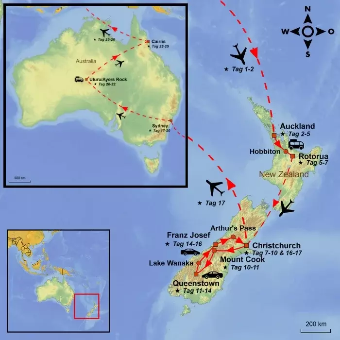 Ihr Abenteuer beginnt in Neuseeland, wo Sie in die faszinierende Maori-Kultur eintauchen, außergewöhnliche geothermische Wunder, Bergseen und Gletscher erleben, bevor Ihre Reise in Australien weitergeht. Dort erwarten Sie die pulsierende Metropole Sydney, das beeindruckend rote Outback rund um den Uluru und zum Abschluss tropisches Flair in Cairns.