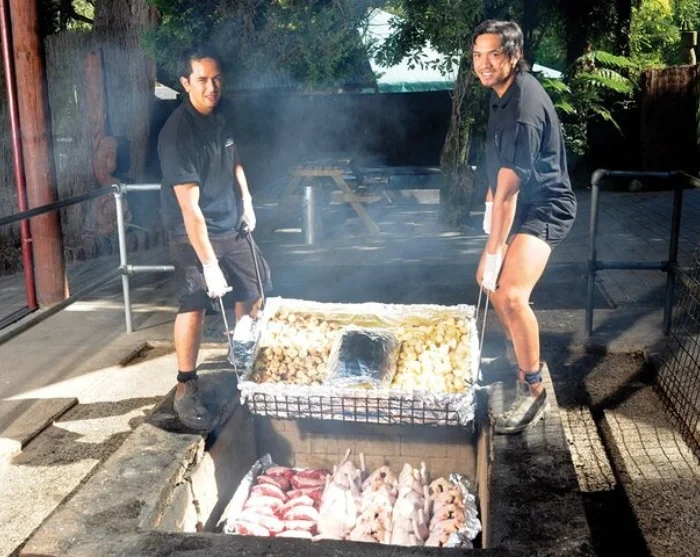 Nach der großartigen Vorstellung folgt ein traditionelles Hangi-Abendessen mit abgehangenem Fleisch und Gemüse, die in einem Erdofen (hāngi) mit warmen Steinen zubereitet werden. Durch das langsame Dämpfen erhält die Speise (Kai) einen guten Räuchergeschmack. Das Abendessen wird in Form eines Buffets angeboten und an gemeinsamen Langtischen gegessen.