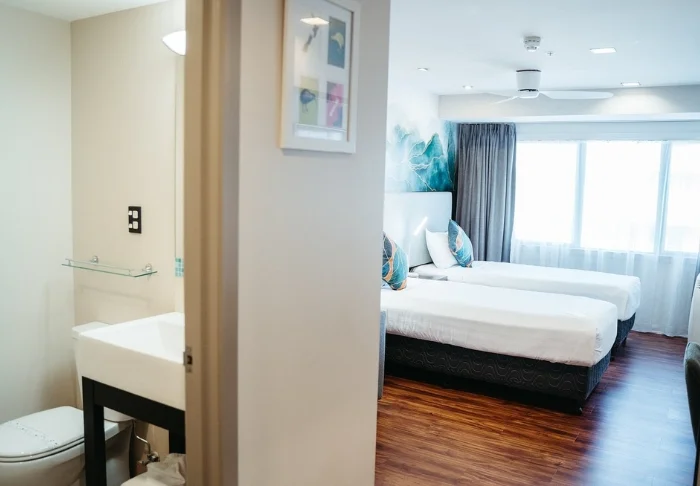 Gegen Aufpreis können Sie in eine Suite mit zwei Schlafzimmern wechseln. Hier erwartet Sie mehr Platz, zwei separate Schlafzimmer und eine voll ausgestattete Küche – geeignet für bis zu 4 Personen.
