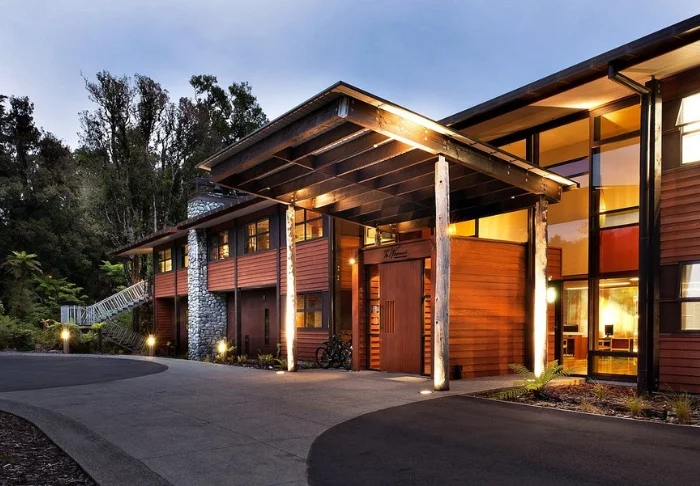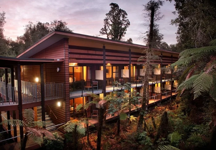 Das 5-Sterne Legacy Te Waonui Hotel liegt friedlich in reizvoller Natur mitten in Franz Josef Village inmitten dichter Wälder, in der Nähe des Gletschers und der kleinen Läden und Restaurants der Stadt. Das Hotel wurde naturnah wunderschön in die grüne Landschaft eingebettet und fügt sich fast nahtlos in die Umgebung ein. Man legt großen Wert auf Nachhaltigkeit, was sich in den energieeffizienten Ansätzen, natürlichen Werkstoffen und Recyclingholz im Aufbau zeigt.