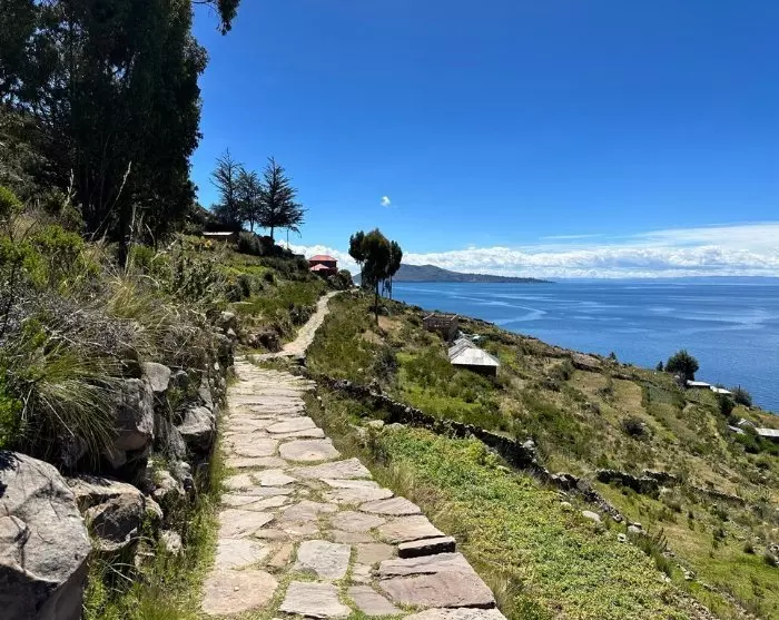 Sie genießen das Mittagessen auf der herrlichen, hügeligen Insel. Danach nimmt Ihr Guide Sie mit auf einen Spaziergang zum höchsten Punkt der Insel, von wo aus Sie eine atemberaubende Aussicht auf den Titicacasee und den hohen Bergen am Horizont haben.