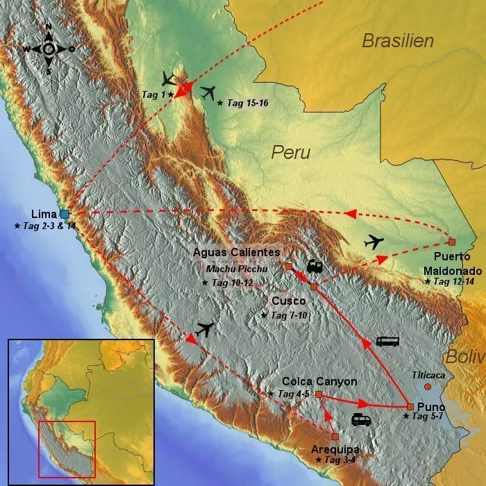 Peru ist ein unglaublich schönes und faszinierendes Land – und auf dieser Rundreise erwartet Sie ein Abenteuer, das Sie nie vergessen werden. Freuen Sie sich darauf, die Städte Lima und Arequipa kennenzulernen, die durch ihre beeindruckenden Kolonialbauten beeindrucken. Vor der imposanten Kulisse mächtiger Vulkane erleben Sie die spektakuläre Colca-Schlucht, gesäumt von einladenden Dörfern, uralten Terrassenfeldern und einer faszinierenden Tierwelt, zu der Lamas, Alpakas und majestätische Kondore zählen. In der schwindelerregenden Höhe des Titicacasees erhalten Sie eindrucksvolle Einblicke in das Alltagsleben und die Kultur der indigenen Bevölkerung dieser Region. Sie besuchen die einstige Hauptstadt der Inkas, Cusco, die für ihre beeindruckende Steinbaukunst berühmt ist, sowie das Heilige Tal mit seinen imposanten Terrassenlandschaften, stimmungsvollen Dörfern und farbenfrohen Märkten. Ein Besuch des weltberühmten Machu Picchu – einem der Neuen Sieben Weltwunder – darf natürlich nicht fehlen. Ihr Abenteuer endet im grünen Amazonas-Regenwald, der mit seiner schillernden Vielfalt an Schmetterlingen, Fröschen, Papageien, Affen und einer unglaublichen Fülle satter Vegetation zum Leben erwacht.