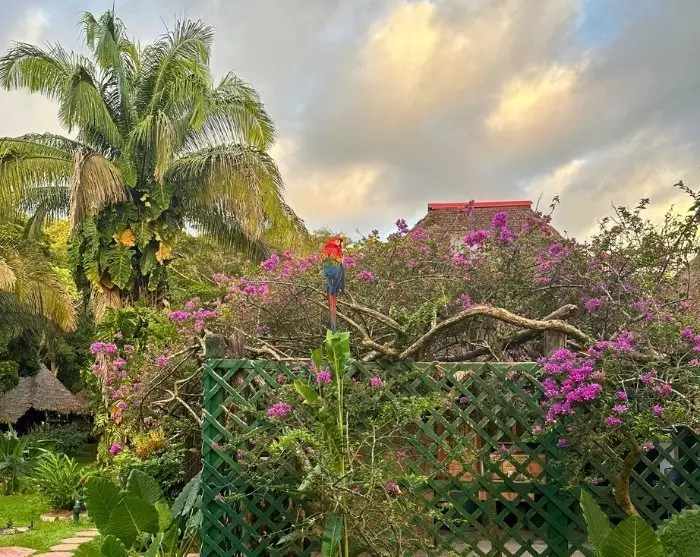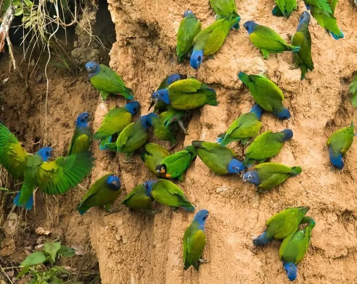 Frühmorgens machen Sie eine 20-minütige Wanderung zur Lehmwand Parrot Clay Lick, wo mehrere Papageienarten leben. Die Papageien leben normalerweise von Obst, Samen, Nüssen, Blumen und Blättern, aber einige dieser enthalten Gift und ätzende Stoffe, sodass die Papageien angeblich den Lehm fressen, um diese Stoffe zu neutralisieren.