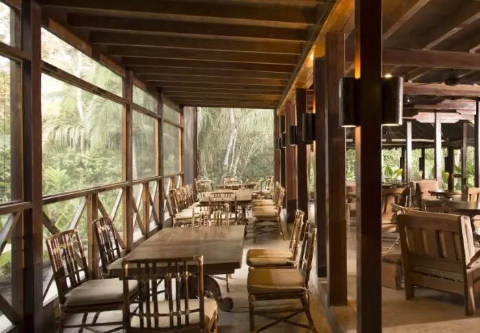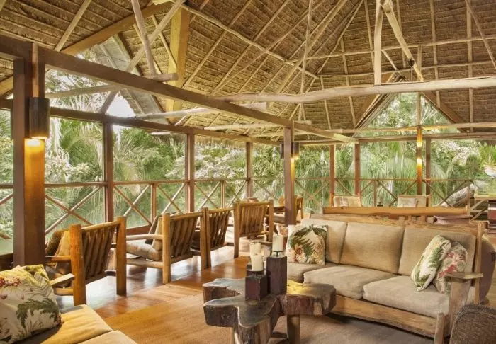 Im ersten Stock befindet sich ein Loungebereich, wo Sie sich mit einem guten Buch auf dem Sofa entspannen oder die Erlebnisse des Tages mit anderen Reisenden teilen können. Hier oben können Sie aber auch einen leckeren Cocktail genießen, während die Sonne untergeht und die nachtaktiven Tiere des Dschungels sowie die Insekten erwachen. Sie werden überrascht sein, wieviel „natürlichen Lärm“ die Tiere und Insekten hier draußen machen.