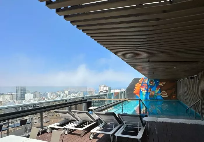 Wenn sich der Tag dem Ende zuneigt, können Sie die Aussicht mit einem Pisco Sour in der Dachbar des Hotels genießen, während der Sonnenuntergang den Himmel langsam in wunderschöne Farben taucht.