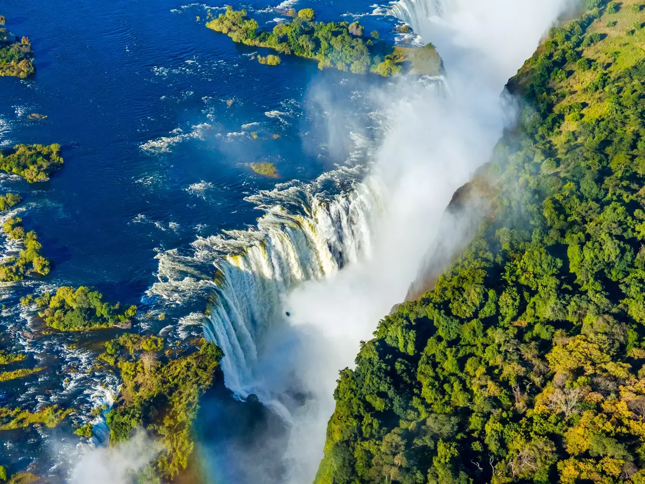 Die Wasserfälle erstrecken sich über 1,7 km. Jede Sekunde stürzen mehr als 1.000 Kubikmeter Wasser rund 100 Meter in die Tiefe. Noch dazu erheben sich die Wasserspritzer mehrere hundert Meter über den Wasserfällen in die Luft. Das ähnelt Rauch zum Verwechseln, weshalb die Einheimischen den Wasserfall auch „Mosi-oa-Tunya“ nennen, was übersetzt „Rauch, der donnert“ bedeutet.