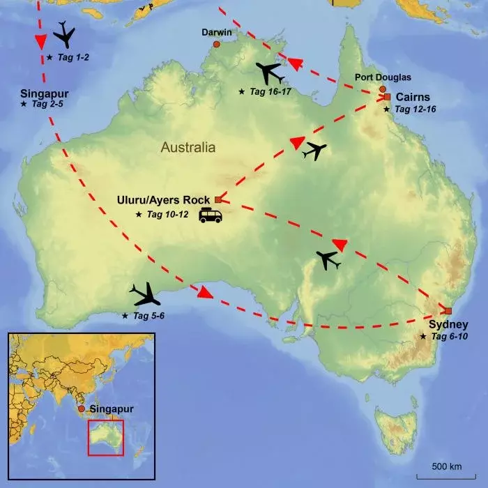 Freuen Sie sich auf einen Aufenthalt im wunderschönen Singapur, bevor es zu den großen Kontrasten in Australien weitergeht. In Down Under warten Melbourne, Sidney und die rote Wüste auf Sie, bevor Sie den Urlaub im tropischen Cairns beenden.