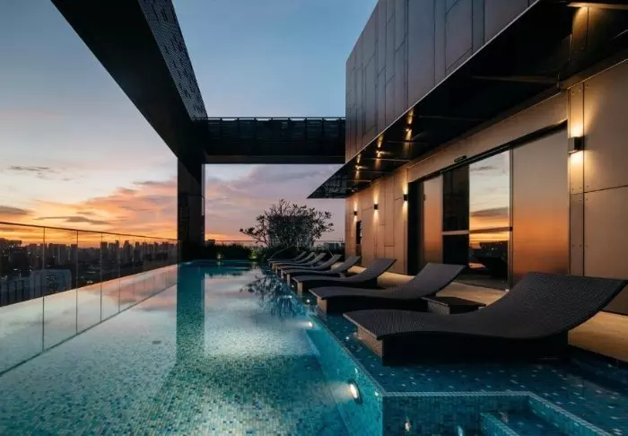 Auf der obersten Etage des Hotels befindet sich der Sky Pool und bietet eine atemberaubende Aussicht auf die ganze Stadt. Dort können Sie sich auf einer Sonnenliege am Pool mit einem guten Buch entspannen oder nach einem langen Tag voller Eindrücke den wunderschönen Sonnenuntergang genießen.