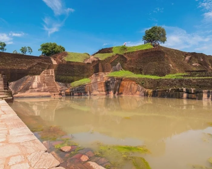 Oben auf dem flachen Felsen finden Sie ein unvergessliches Erlebnis. Hier bestaunen Sie den Panoramablick über die antiken Palastruinen mit ihren Gräben, Wasserelementen und üppigen Gärten. Am Horizont erstreckt sich eine grüne Weite von Dschungel, Bergen und Dörfern, mit dem entfernten Anblick des Pidurangala-Felsens.