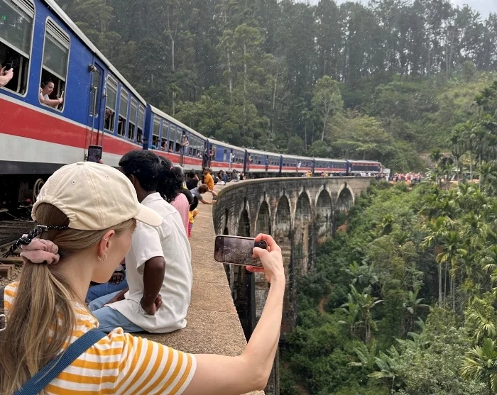 Neben den Schienen könnte Ihnen Gesellschaft von kleinen Eidechsen und bunten Vögeln geleistet werden. Bei perfektem Timing erleben Sie einen Zug, der über die Brücke fährt – ein magischer Moment, der die Architektur der Brücke, die üppige Landschaft und die ikonischen Züge Sri Lankas verbindet.