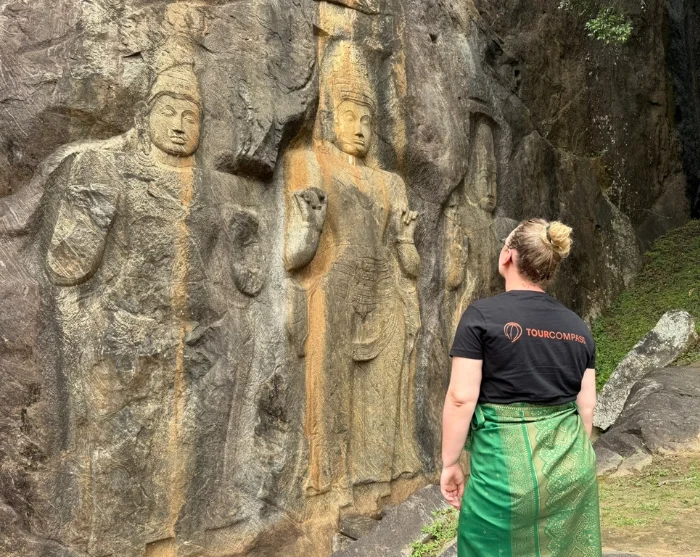 Weiter geht es zum Buduruwagala-Tempel, der ins 10. Jahrhundert zurückreicht und für seine gut erhaltenen Felsenkunstwerke bekannt ist. Der Tempel besteht aus einer großen Felswand mit einer 16 Meter hohen Buddha-Statue, umgeben von sechs kleineren Figuren, die Buddha in verschiedenen meditativen Haltungen darstellen. Ihre filigranen Details und gelassenen Ausdrücke können in aller Ruhe bewundert werden, da Buduruwagala ein ruhigeres Dasein führt als die zuvor besuchten Tempel.