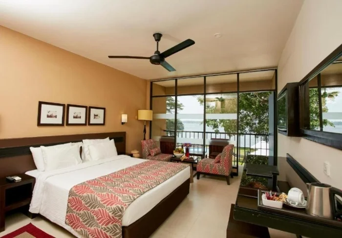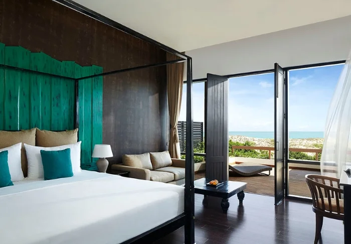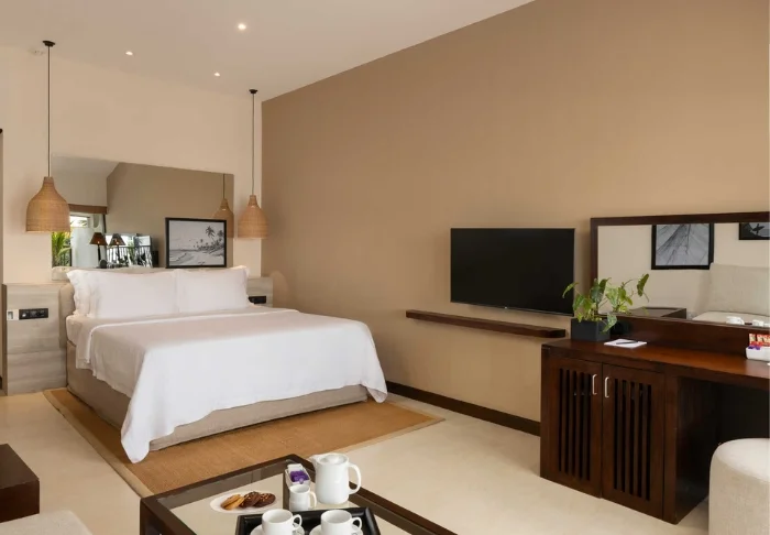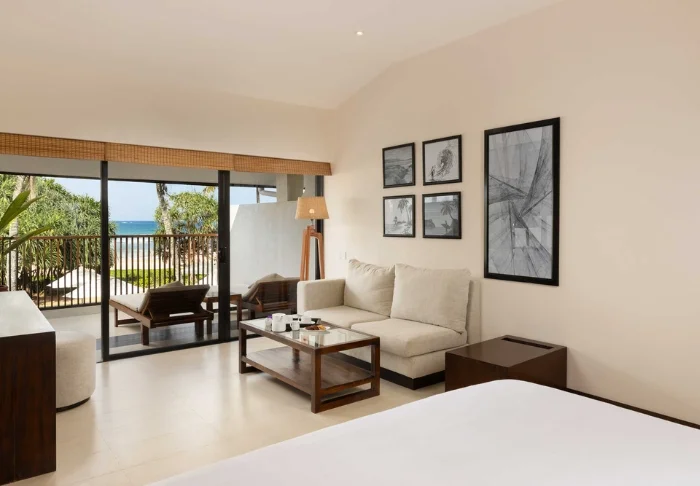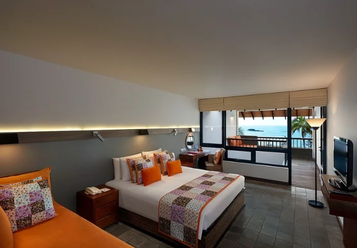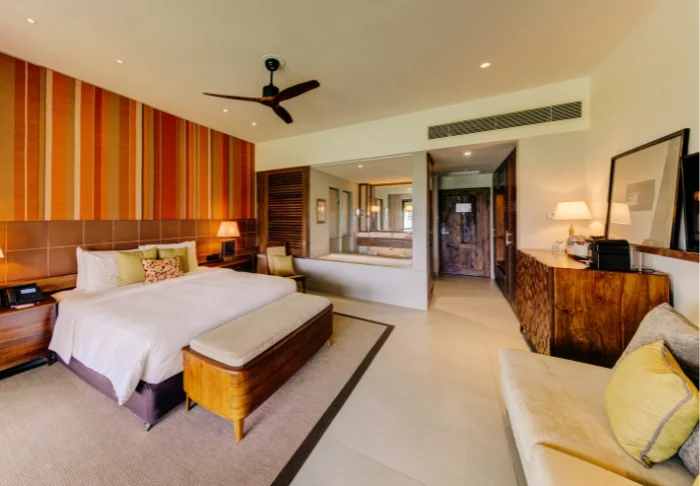 Ihre Unterkunft ist ein großzügiges Superior Zimmer mit rustikalem Dekor. Dunkle Holzmöbel und helle Textilien schaffen eine warme, authentische Atmosphäre. Von Ihrem privaten Balkon blicken Sie auf die Gärten und das Meer – Palmen wiegen sich im Wind und das sanfte Rauschen der Wellen bietet die perfekte Kulisse für Ihren Morgenkaffee oder eine entspannte Lesestunde. Alle Zimmer verfügen über Klimaanlage, WLAN, Deckenventilator, Safe, Minibar, Telefon, TV, Möglichkeiten zur Tee- und Kaffeezubereitung sowie ein Bad mit begehbarer Dusche, Bademantel, Hausschuhen und kostenfreien Pflegeprodukten.