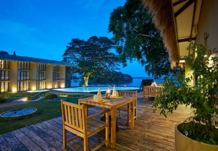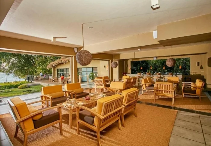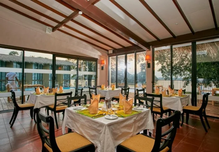 Auf der erhöhten Holzterrasse des Hotels befindet sich das Restaurant, das sowohl drinnen als auch draußen serviert. Hier genießen Sie Ihre Halbpension mit einem herrlichen Panoramablick über den See und wählen dabei aus lokalen und westlichen Gerichten. Perfekt lässt sich Ihr Tag dann an der Bar des Hotels abrunden – der ideale Ort, um einen geschmackvollen Sundowner zu genießen.