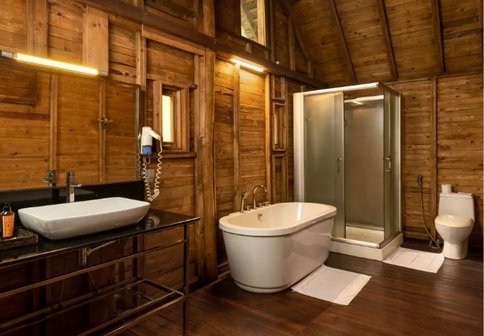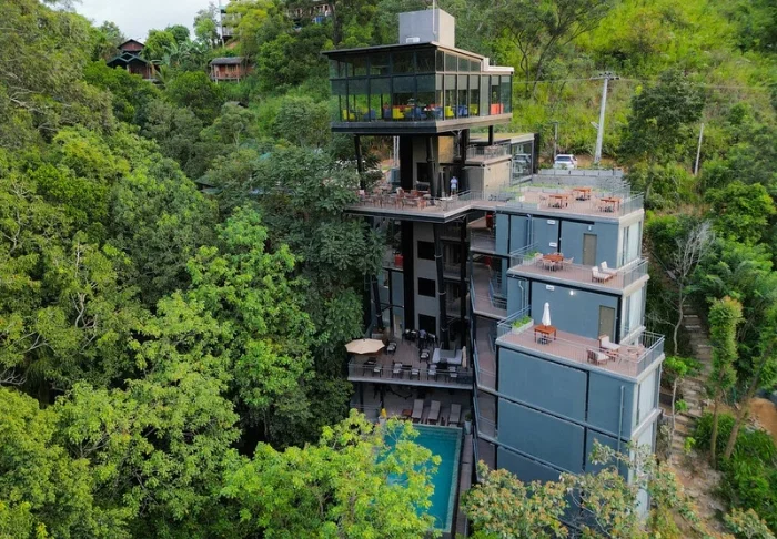 Die Lodge besteht aus 20 Hütten, die über die grüne Teeplantage verteilt sind. Alle wurden aus Recycelmaterialien errichtet. Die Hütten selbst bestehen aus alten Schiffscontainern. Wände und Decken wurden aus Bambus, die Terrassen aus Eisenbahnschwellen errichtet.