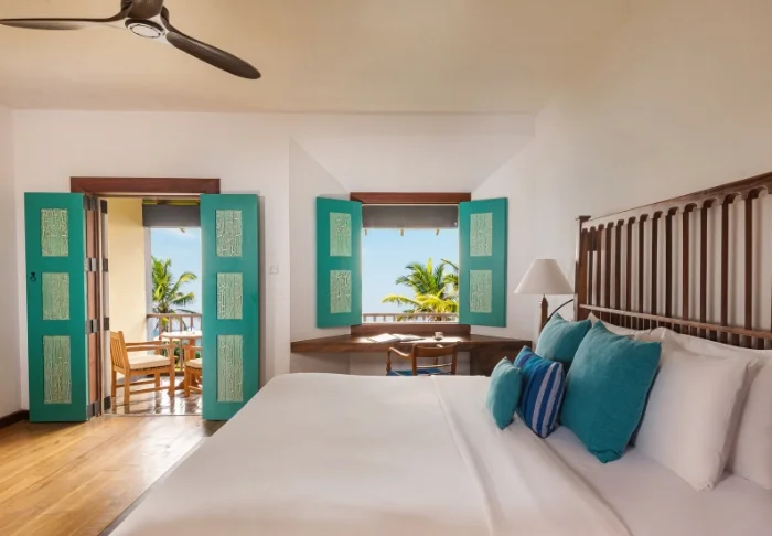 Während Ihres Aufenthalts übernachten Sie in der Regel in einem Deluxe-Zimmer. Die Ausstattung ist hell und schlicht, dennoch verfügt jedes Zimmer über Klimaanlage, WLAN, Minibar, TV, Telefon, Tee- und Kaffeezubereitungsmöglichkeiten sowie ein Badezimmer mit begehbarer Dusche und kostenlosen Pflegeprodukten. Genießen Sie auf Ihrem privaten Balkon die sanfte Meeresbrise und das tropische Flair, das durch den palmengesäumten Pool des Hotels und den glitzernden Indischen Ozean unterstrichen wird.