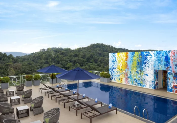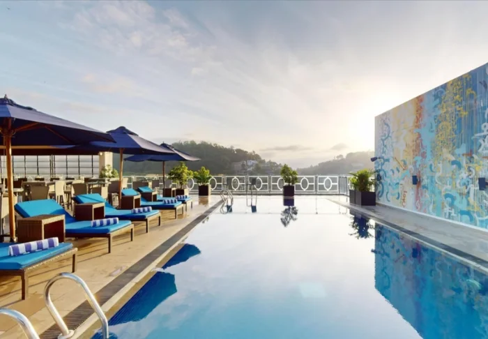Auf der neuen Dachterrasse des Hotel OnRock erwartet Sie ein einladender Swimmingpool, in dem Sie sich erfrischen und dabei die wunderschöne Aussicht genießen können. Die angrenzende Poolbar serviert lokale Teespezialitäten, frisch gebrühten Kaffee und gekühlte Drinks – am besten bei einem atemberaubenden Blick auf die Silhouette der Berge.