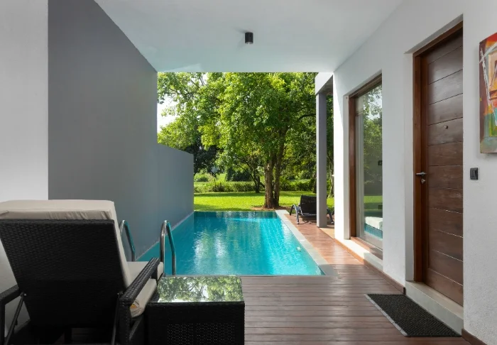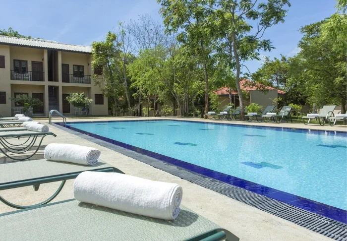 Nach einem erlebnisreichen Tag im historischen Anuradhapura können Sie sich wohlverdient in einem Liegestuhl am Pool rekeln oder sich am Beckenrand mit einem Getränk von der Bar entspannen, während Sie die ruhige und friedliche Umgebung genießen.