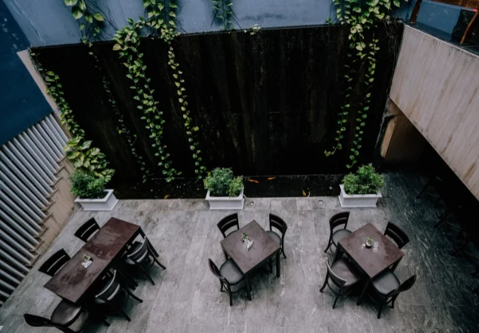 Im gemütlichen Innenhof des Hotels schaffen üppiges Grün und ein Teich voller orangefarbener Karpfen eine ruhige Oase. Jeden Morgen wird hier ein liebevoll zubereitetes Frühstück serviert, das die einladende und familiäre Atmosphäre unterstreicht, die Sie während Ihres gesamten Aufenthalts begleitet.