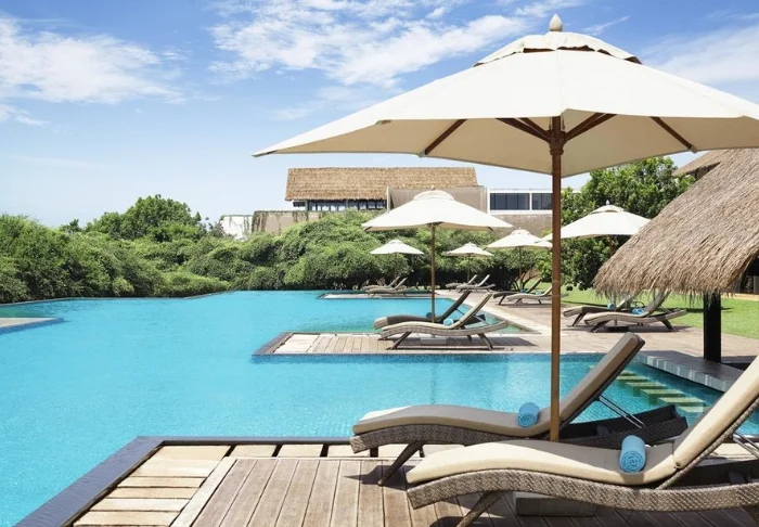 Der großzügige Poolbereich des Hotels erstreckt sich entlang des Strandes, umgeben von Palmen und üppigem Grün. Hier können Sie sich bei einem erfrischenden Bad abkühlen oder auf einer Sonnenliege mit einem kühlen Getränk entspannen. Wer sich etwas gönnen möchte, findet im Spa eine Auswahl an wohltuenden Massagen und Schönheitsanwendungen. Für alle, die aktiv sein möchten, stehen zudem ein Fitnessraum und sogar ein Squash-Court zur Verfügung. Direkt am Strand warten die hoteleigenen Liegen und Sonnenschirme darauf, dass Sie sich bei vollkommener Ruhe und Entspannung der Sonne hingeben.