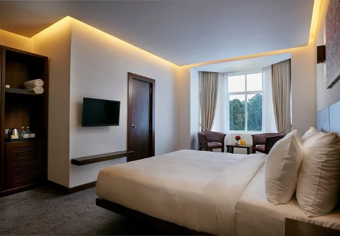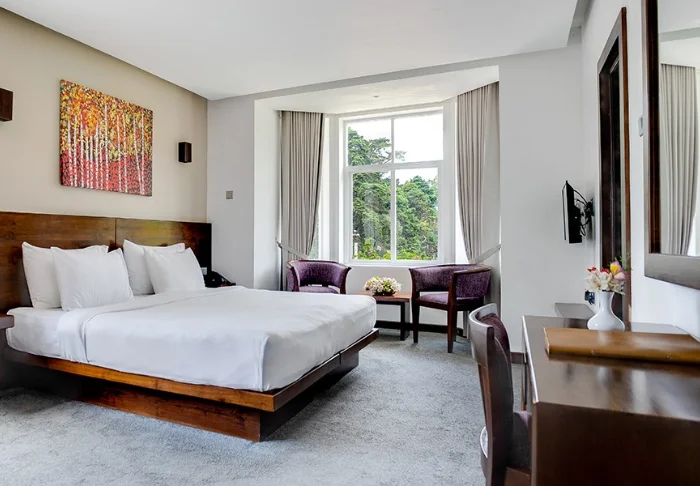 Standardmäßig übernachten Sie in einem geräumigen Deluxe Zimmer, das geschmackvoll in dezenten Farben und warmen Tönen gestaltet ist. Zur Ausstattung gehören ein Kleiderschrank, ein Schreibtisch, eine gemütliche Sitzecke sowie ein Bad mit begehbarer Dusche und kostenlosen Pflegeartikeln. Da das Klima im Hochland recht kühl sein kann, ist das Zimmer mit einer Heizung für Ihren Komfort ausgestattet. Darüber hinaus stehen Ihnen WLAN, eine Minibar, ein Safe sowie Tee- und Kaffeezubereitungsmöglichkeiten zur Verfügung.