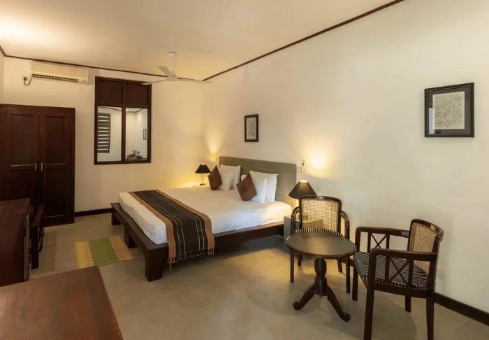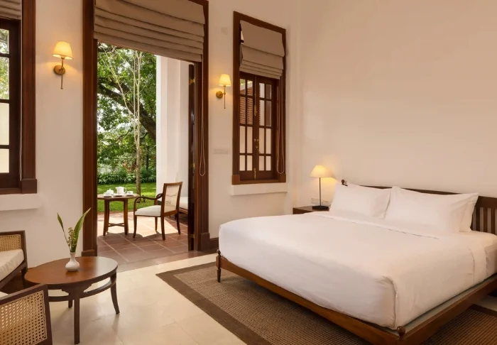 Sie wohnen standardmäßig in einem Bungalow-Zimmer, das im einladenden Garten des Hotels liegt. Das Zimmer ist einfach, aber geschmackvoll im klassischen Kolonialstil eingerichtet. Es bietet viel Platz und zahlreiche Annehmlichkeiten wie Klimaanlage, Minikühlschrank, Tee- und Kaffeezubereitungsmöglichkeiten sowie ein großzügiges Bad mit kostenfreien Pflegeprodukten. Auf Ihrer privaten Terrasse erwarten Sie besondere Momente zu zweit – ob beim Kartenspielen oder bei anregenden Gesprächen, während Ihr Blick über die grüne Landschaft schweift.
