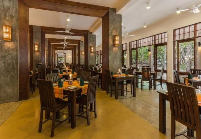 Im Hotelrestaurant genießen Sie Ihr Frühstück in entspannter Atmosphäre und haben dabei die Wahl zwischen westlichen und sri-lankischen Spezialitäten. Auf Wunsch können Sie hier ebenso Ihre weiteren Mahlzeiten einnehmen. Die Köche verwöhnen Sie mit köstlichen Gerichten, die sie mit frischem Gemüse und Kräutern aus den umliegenden Dörfern zubereiten. Wenn der Abend anbricht, lassen Sie den Tag mit einem lokalen Bier an der Bar ausklingen und genießen dabei den Blick auf den Garten des Hotels und die sattgrünen Reisfelder dahinter.