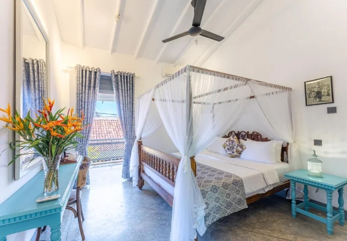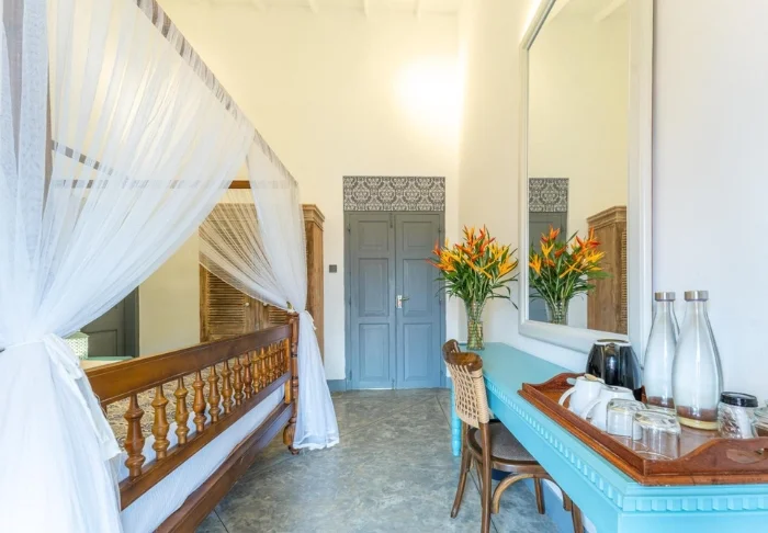 Während Ihres Aufenthalts übernachten Sie in einem Standardzimmer, das mit seinem gemütlichen Ambiente zum Wohlfühlen einlädt. Die Einrichtung ist klassisch gehalten, mit dunklem Holz und einem Himmelbett, das den kolonialen Charakter des Hauses stilvoll widerspiegelt. Genießen Sie Annehmlichkeiten wie Klimaanlage, WLAN, Tee- und Kaffeezubereitungsmöglichkeiten, kostenloses Mineralwasser und ein privates Bad mit eleganter Dusche sowie hochwertigen Pflegeprodukten. Auf Ihrem eigenen Balkon können Sie wunderbar entspannen und die ruhige Alltagsatmosphäre in den kleinen Gassen der Festung auf sich wirken lassen.
