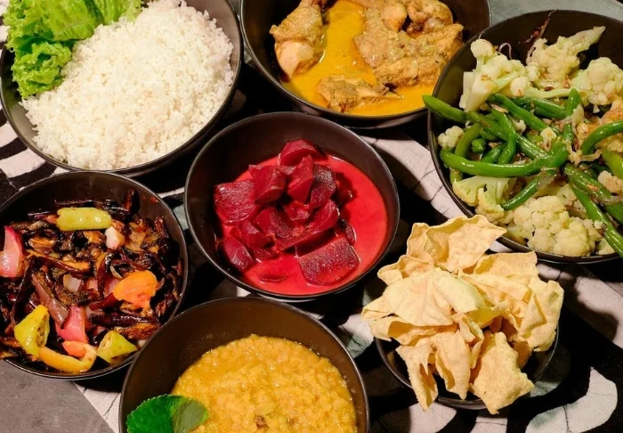 Das Restaurant des Chaaryas serviert leckere, traditionell sri-lankische, orientalische und westliche Gerichte aus frischem Gemüse, frischem Obst, frischem Fisch und frischem Fleisch aus den umliegenden Dörfern.