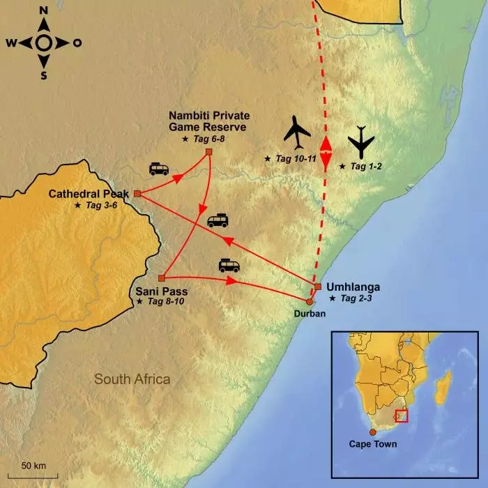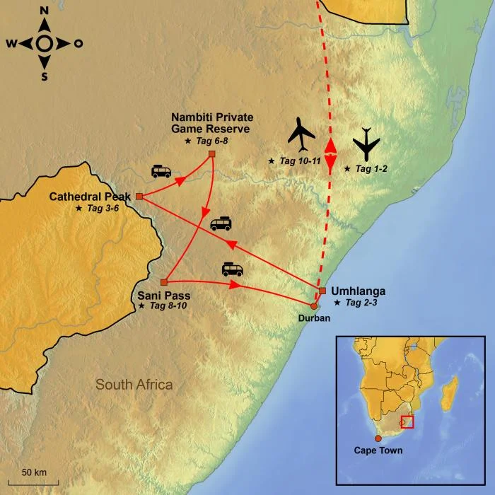 Heute fliegen Sie ab Ihrem gewählten Flughafen – mit Zwischenlandung(en) unterwegs. Ihr Ziel ist die Provinz KwaZulu-Natal in Südafrika.