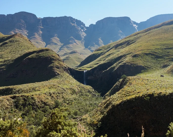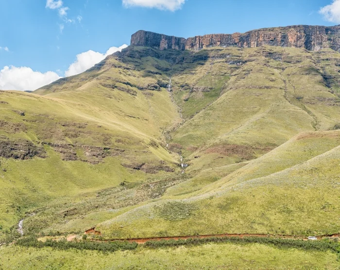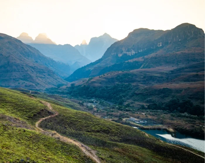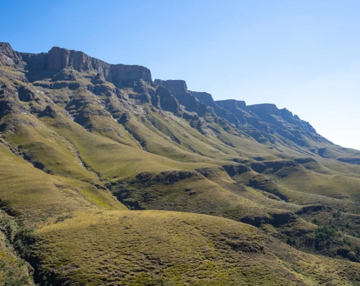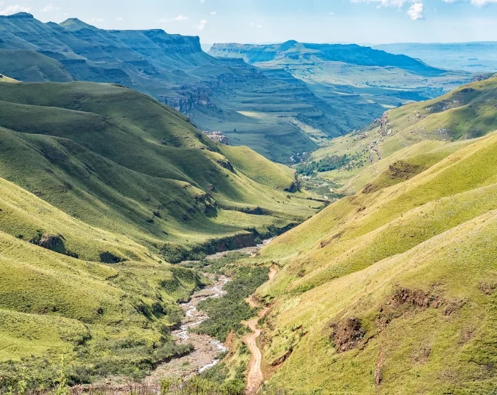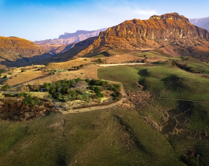 Von Nambiti aus fahren Sie gen Süden. Bald lassen Sie die Savanne des Schutzgebietes hinter sich und sind erneut von sanften Hügeln und grünen Weiden umgeben. Nach ein paar Stunden Fahrt (abhängig vom Verkehr und davon, wie oft Sie unterwegs anhalten) tauchen die zerklüfteten Berge langsam wieder am Horizont auf.