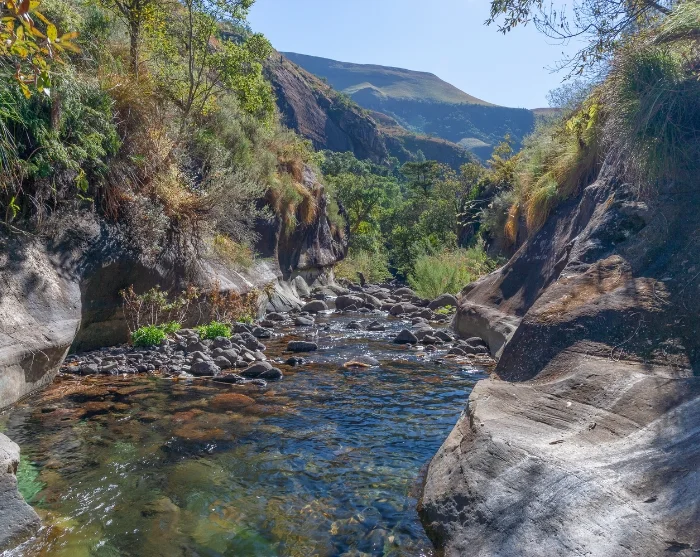 Von hier geht es hinauf in die Drakensberge, wo die spektakuläre Natur ein Erlebnis wie kein anderes bereithält. Schnüren Sie die Wanderschuhe, atmen Sie die frische Bergluft und genießen Sie die grandiosen Ausblicke auf die gezackten Gipfel.
