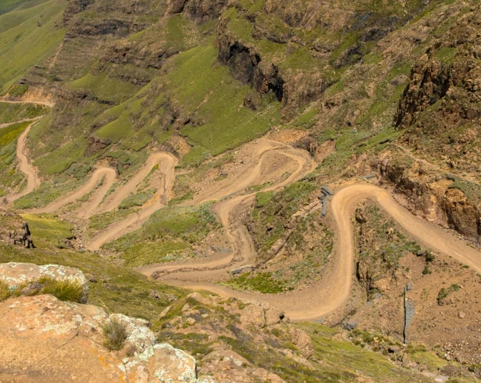 Am Ende der kurvenreichen Straße liegt das Königreich Lesotho. Schon an der Grenze eröffnet sich der Blick auf die umliegende Bergwelt zu beiden Seiten, und das Wetter kann schnell umschlagen – von Sonne und klarer Sicht zu Nebel oder einem kühlen Wind.