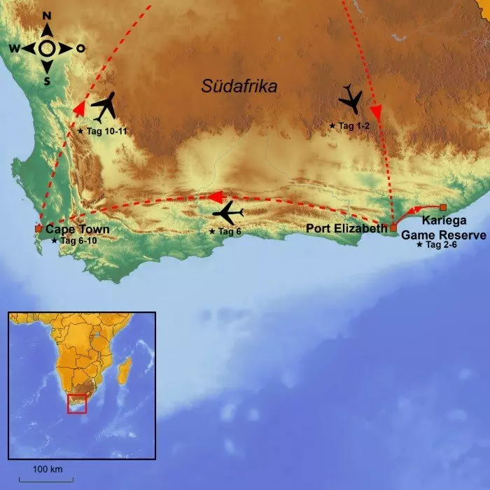 Nach der Ankunft am Flughafen treffen Sie den Chauffeur, der Sie zur Kariega Game Reserve bringt. Die Strecke ist 120 km lang, die Fahrt dauert ca. 1½ Stunden.