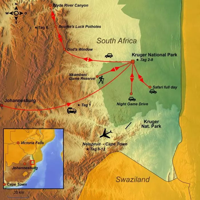Sie übernachten in der Nähe zum Krüger-Nationalpark. Kommen Sie auf eine Safari, einen geführten Bush Walk, sehen Sie die Panoramaroute und beenden Ihre Reise in Cape Town.
