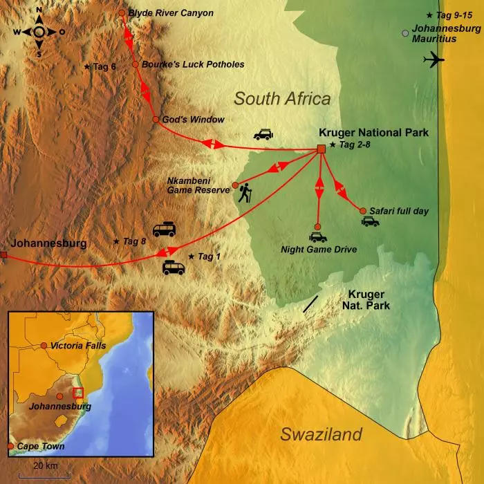 Während der Reise wohnen Sie in der Kruger Gate Hotel an der Grenze zu dem Kruger National Park. Dort werden Sie Safaris unternehmen und dabei Elefanten, Nashörner, Büffel, Löwen und Leoparden zu Gesicht bekommen. Den Geheimnissen der afrikanischen Natur kommen Sie bei einer Exkursion mit einem Ranger auf die Spur.