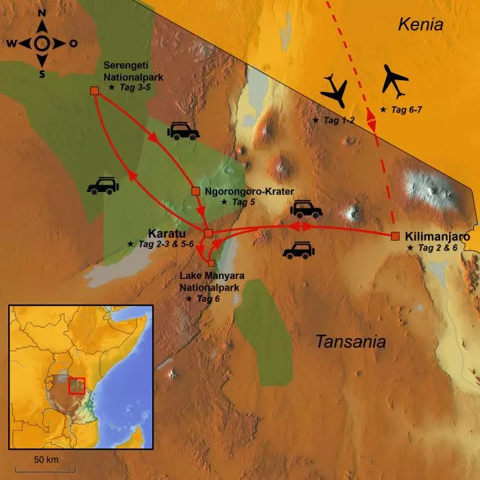 Am Flughafen Kilimanjaro wartet Ihr Fahrer/Reiseleiter bereits auf Sie und bringt Sie zu Ihrem Hotel. Die rund 200 km lange Fahrt wird mit Sightseeing kombiniert. Sie fahren durch die Dörfer Chini, Kisongo, Makuyuni und Mto Wa Mbu bis zur Hügellandschaft von Karatu.