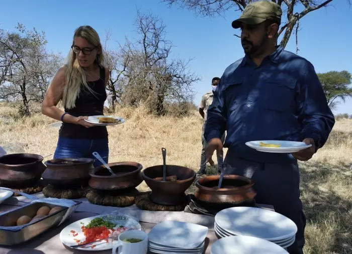 Ein Bush Lunch besteht typischerweise aus verschiedenen Fleisch-, Fisch- und Hühnchengerichten sowie verschiedenen Salaten und Gemüse. All das wird als Buffet serviert, welches außerdem natürlich auch frisches Obst und Desserts beinhaltet. An der Bar können Sie Getränke kaufen. Und dann können Sie sich einfach gemütlich hinsetzen und Ihr Mittagessen mit Aussicht auf die Tiere der Ebene genießen.