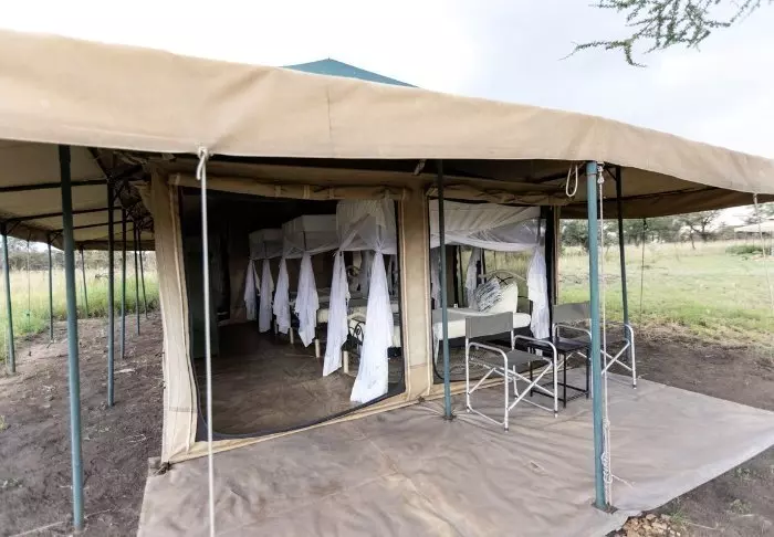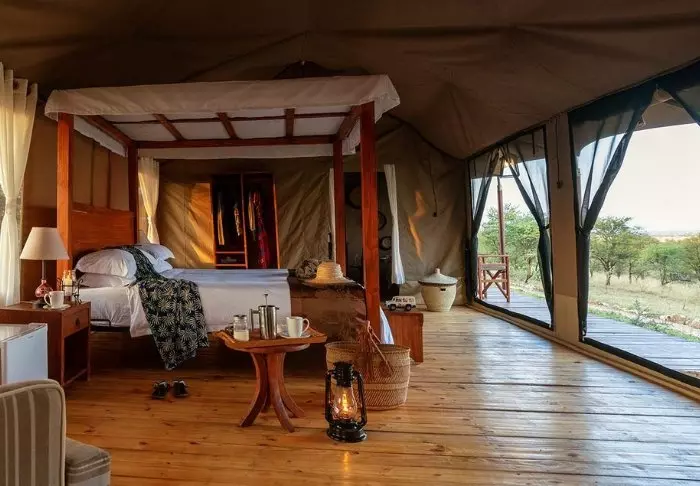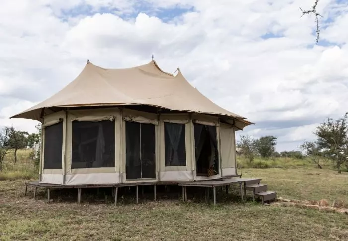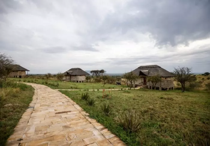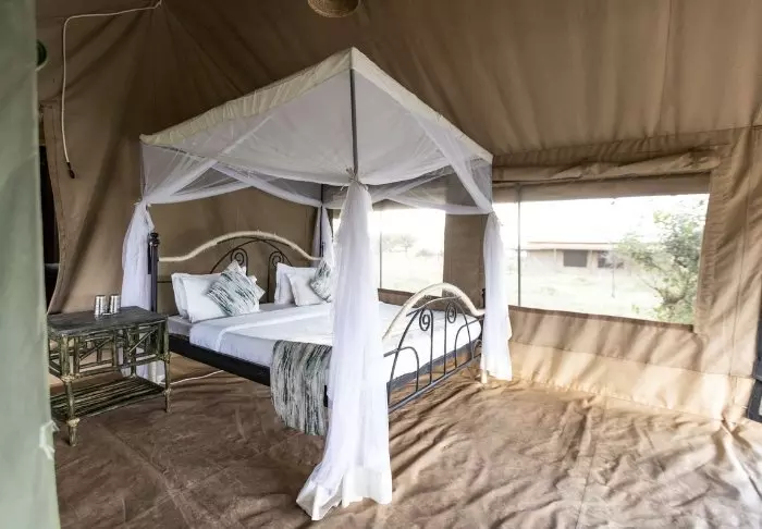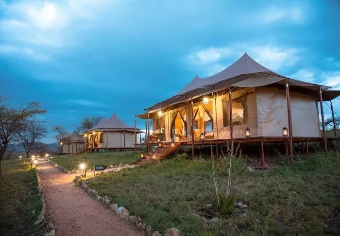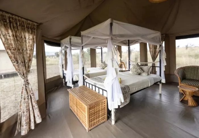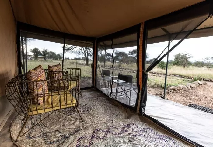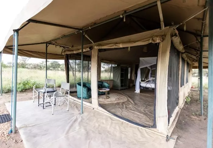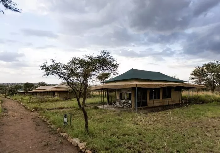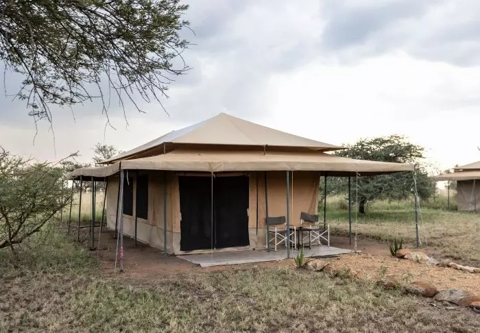 Es gibt hier 25 gemütliche Zelte, die alle auf Steinterrassen errichtet worden sind. Somit hat man vor dem Zelt eine eigene Veranda. Und von dort blickt man auf die Serengeti. In allen Zelten kann man aufrecht stehen, es ist genügend Platz für die Betten. Es gibt fließendes Wasser, Toiletten, Duschen, Moskitonetze und elektrisches Licht – all das bei Kanevaswänden, sodass man die afrikanische Natur direkt vor dem Zelt hören kann. Ein echtes Safarierlebnis.