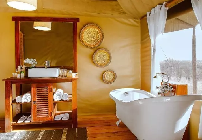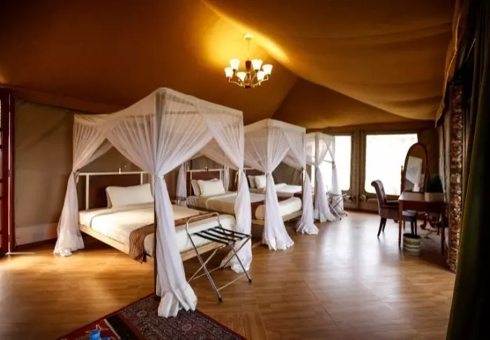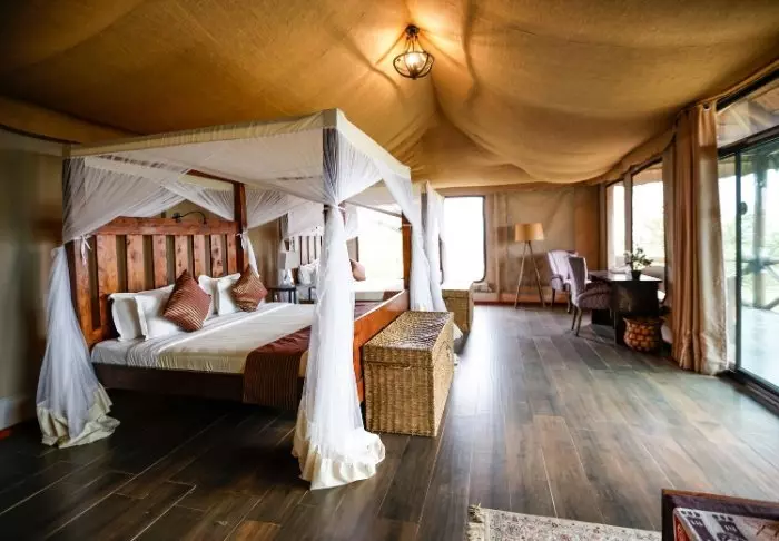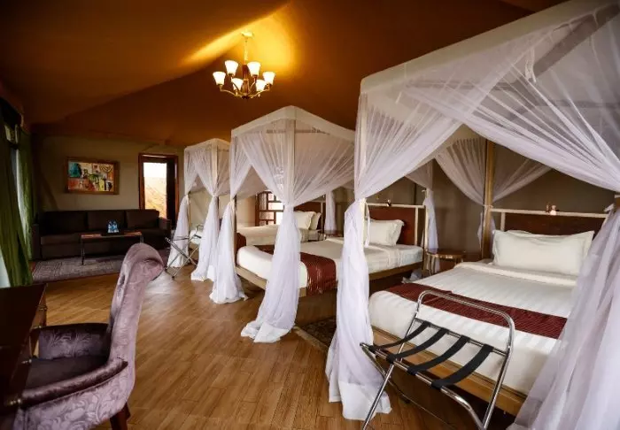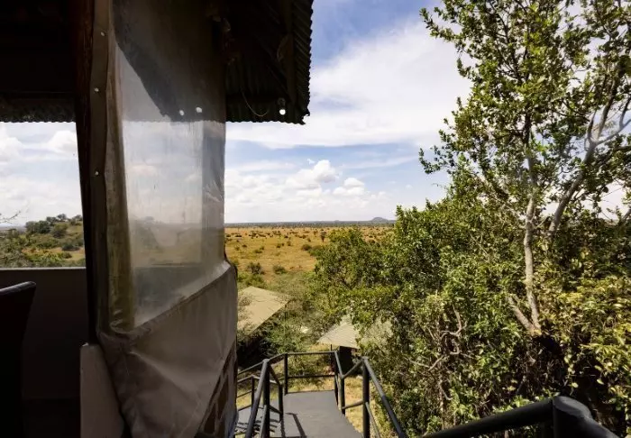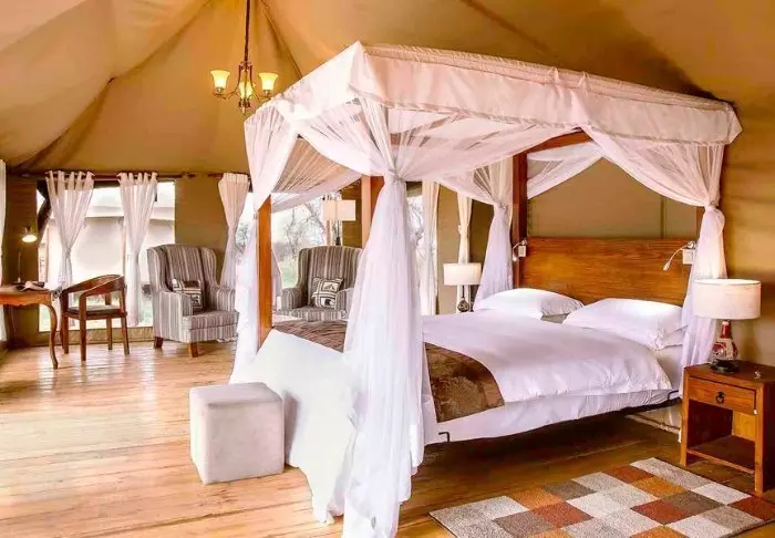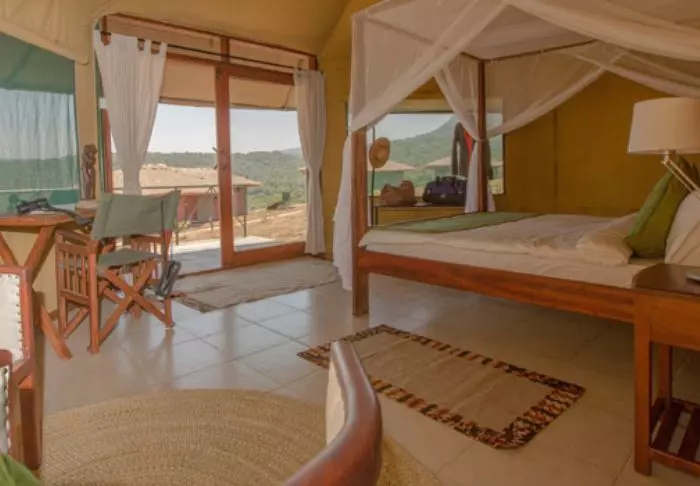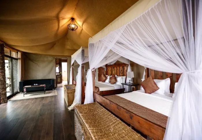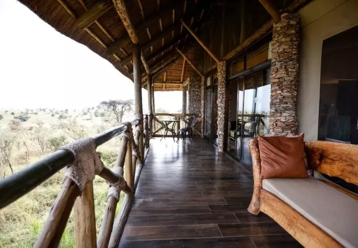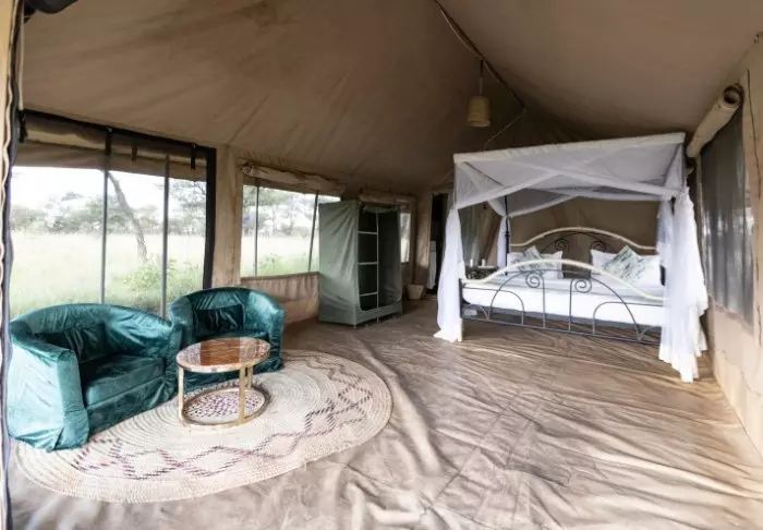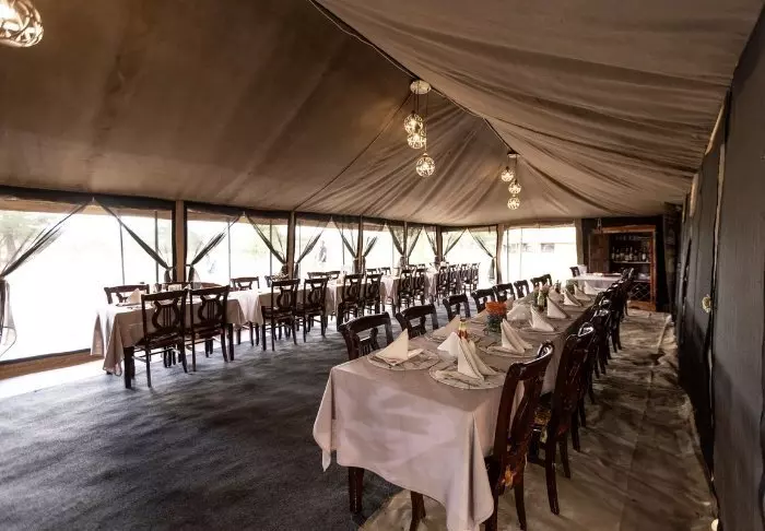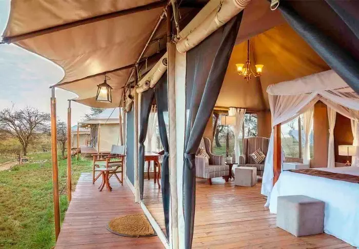 Es gibt hier 25 gemütliche Zelte, die alle auf Steinterrassen errichtet worden sind. Somit hat man vor dem Zelt eine eigene Veranda. Und von dort blickt man auf die Serengeti. In allen Zelten kann man aufrecht stehen, es ist genügend Platz für die Betten. Es gibt fließendes Wasser, Toiletten, Duschen, Moskitonetze und elektrisches Licht – all das bei Kanevaswänden, sodass man die afrikanische Natur direkt vor dem Zelt hören kann. Ein echtes Safarierlebnis.