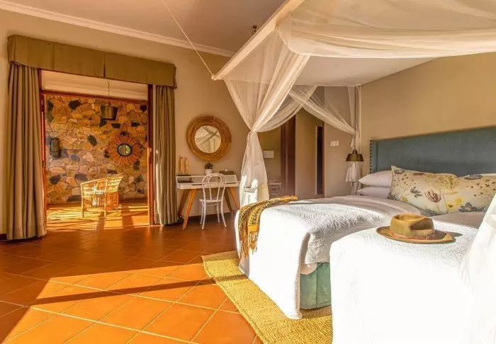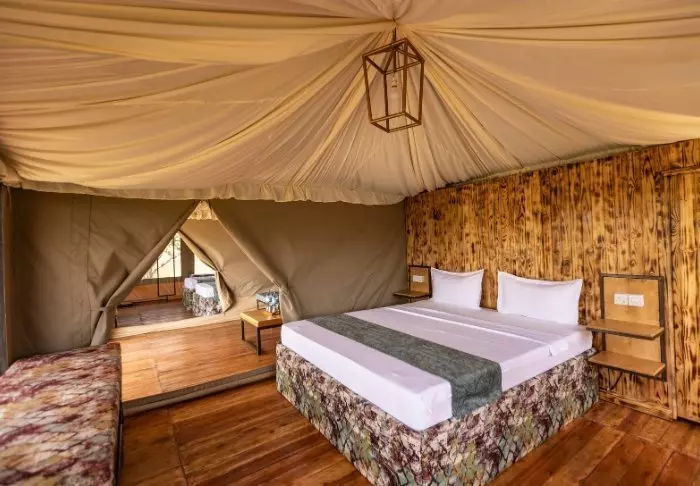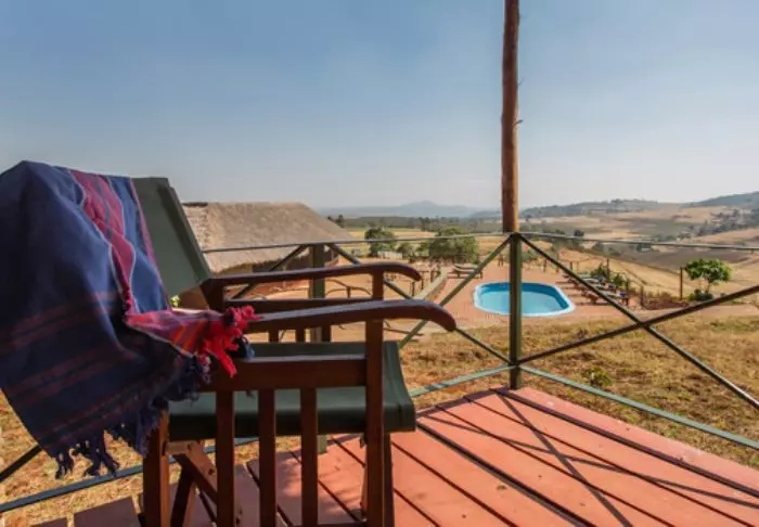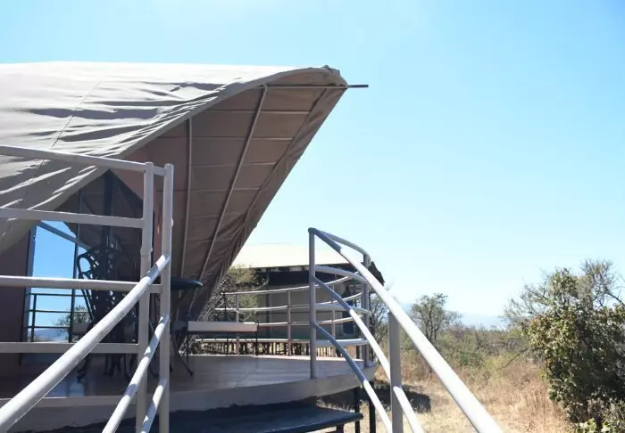 Die Lodge besteht aus 23 Zelten, oder besser gesagt Fusionen aus Zelten und Hütten. Die Zelte haben nämlich fixe Böden und richtige Badezimmer, während die übrigen Seiten des „Zimmers“ aus Kanevas bestehen. Alle Zimmer bieten eine eigene Veranda mit Panorama auf das umliegende Gebiet. Die Zelte sind durch Wege und Grünanlagen miteinander verbunden, sodass Sie stets ein Gefühl der Weitläufigkeit spüren.