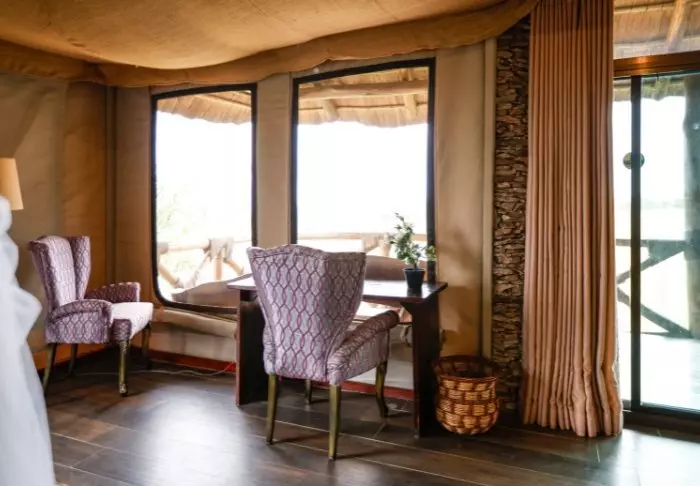 Die Lodge besteht aus 20 individuellen Luxuszelten, die in einer raffinierten Kombination aus Kanevas und Stein errichtet worden sind. Die Seiten bestehen aus Kanevas, sodass Sie die echte Safaristimmung mit den Geräuschen und Gerüchen der Natur hier draußen genießen können, das Dach besteht aus Stroh, Teile der Wände aus Stein, sodass das Gebäude mehr an ein Zimmer als an ein Zelt erinnert. Die Luxuszelte wurden auf Steinpfählen errichtet und schweben beinahe über der Erde, was sowohl für eine gute Luftzirkulation als auch für eine einzigartige Aussicht sorgt.