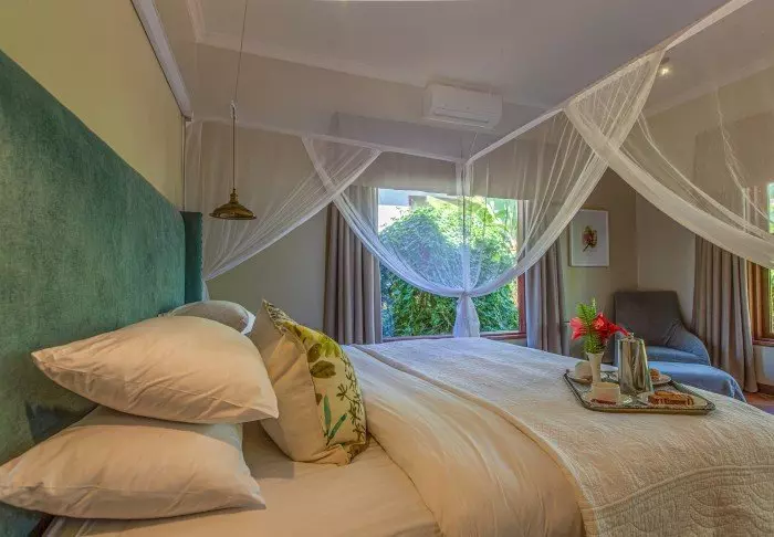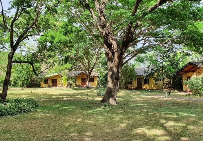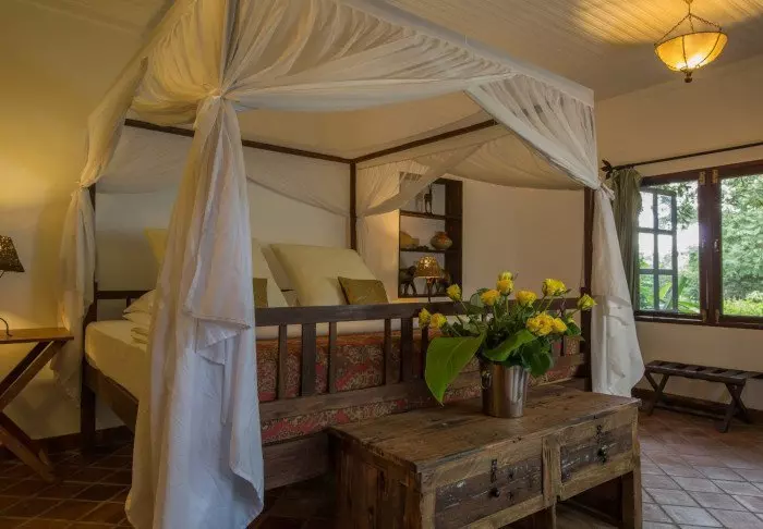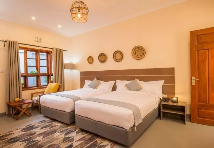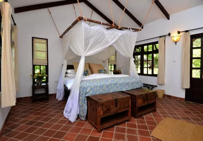 Es handelt sich um eine kleine, exklusive Lodge mit lediglich 24 Hütten im bezaubernden Kolonialstil sowie mit 12 Zimmern im Hauptgebäude mit Terrasse und Balkon, die alle zum Garten hin liegen. Alle Zimmer sind mit Badezimmer mit Dusche sowie mit Ventilator, Tee-/Kaffee-Ecke und Moskitonetz ausgestattet. Auch der Zimmerservice kann gerufen werden.