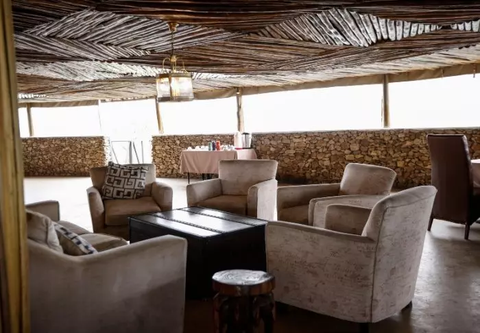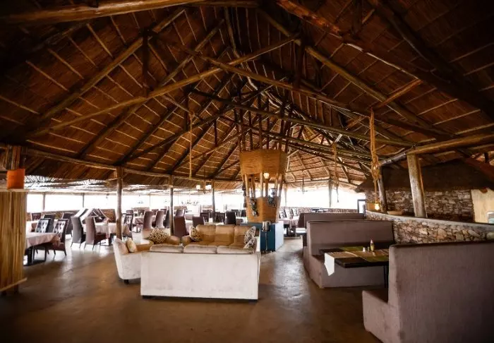 Eines der beiden Restaurants der Lodge befindet sich hoch auf einer Kopje und bietet einen einzigartigen Blick auf die umliegende Gegend. Das zweite Restaurant befindet sich im Hauptgebäude, wo Sie auch die Rezeption und einen einladenden Loungebereich mit Stühlen und Tischen finden.